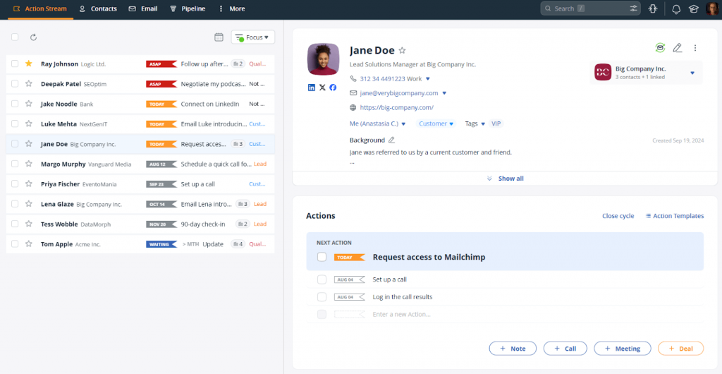 OnePageCRM was designed to help your small business stay organized, build better relationships, and close more sales. To do this, it turns your database into an automatically prioritized to-do list dubbed the Action Stream. There, you’ll find contacts, as well as the next steps to move them forward, all arranged by urgency.