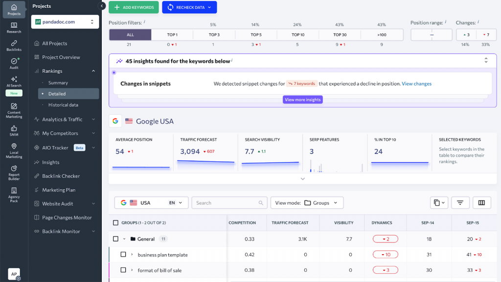 - Rank Tracker to stay on top of daily keyword movements, traffic changes, SERP features, and overall visibility to track growth and competitive shifts.
